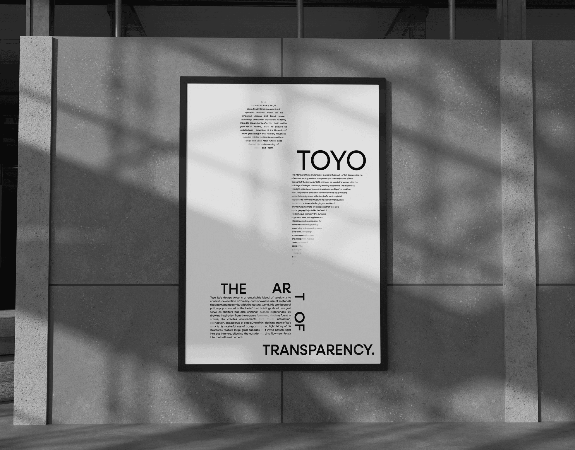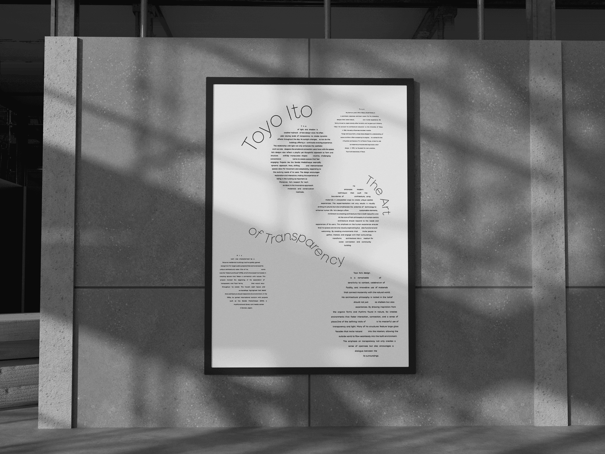 For this communication design project, I explored how typography can translate architectural principles into visual language. Focusing on the work of Japanese architect Toyo Ito, the goal was to create a connotative poster series that captures the conceptual and emotional qualities of his architecture. Using hierarchy, spacing, and form, the designs interpret ideas of transparency, openness, and spatial fluidity within a minimalist typographic framework.